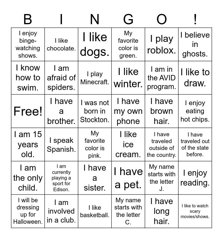 This bingo card has 36 words: I have a pet., I have a sister., My name starts with the letter C., I know how to swim., I am 15 years old., I have my own phone, I am afraid of spiders., I like basketball., I play roblox., My name starts with the letter J., I like to draw., My favorite color is green., I enjoy reading., I have a brother., I like winter., I enjoy binge-watching shows., I am the only child., I have brown hair., Free!, I like dogs., I was not born in Stockton., I speak Spanish., I like ice cream., My favorite color is pink., I have traveled outside of the country., I like chocolate., I am in the AVID program., I am involved in a club., I play Minecraft., I believe in ghosts., I like to watch scary movies/shows., I will be dressing up for Halloween., I have traveled out of the state before., I enjoy eating hot chips., I am currently playing a sport for Edison. and I have long hair..