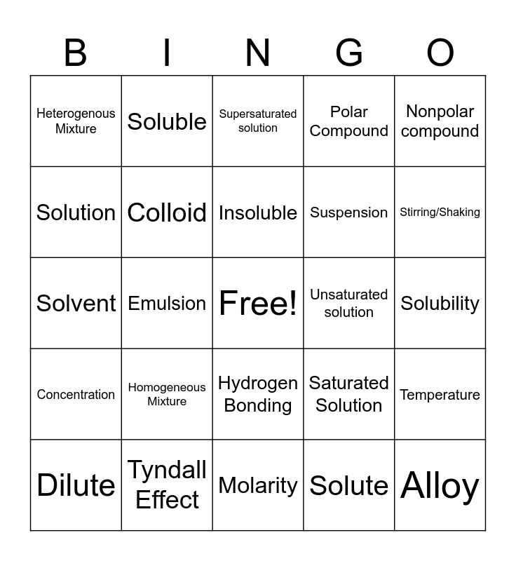 This bingo card has a free space and 24 words: Homogeneous Mixture, Tyndall Effect, Insoluble, Dilute, Nonpolar compound, Heterogenous Mixture, Solution, Soluble, Unsaturated solution, Hydrogen Bonding, Suspension, Solvent, Saturated Solution, Temperature, Colloid, Solute, Solubility, Supersaturated solution, Stirring/Shaking, Emulsion, Alloy, Concentration, Polar Compound and Molarity.
