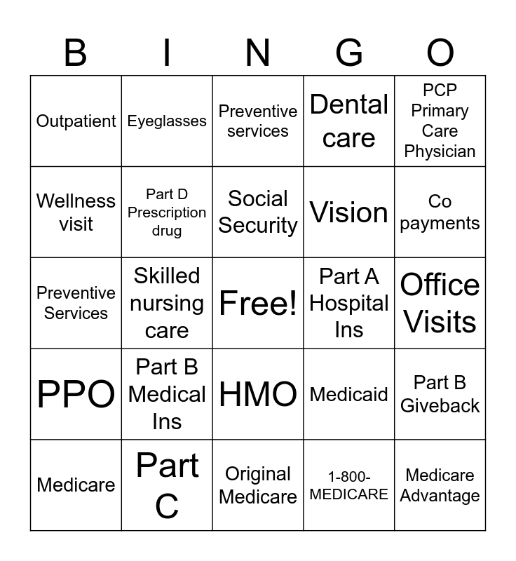 This bingo card has a free space and 29 words: Medicare, Inpatient care, Skilled nursing care, Home health care, Outpatient, Preventive services, Part D Prescription drug, Part B Medical Ins, Part A Hospital Ins, Part C, Office Visits, Medicare Advantage, Original Medicare, 1-800-MEDICARE, Co payments, Hearing aids, HMO, PPO, PCP Primary Care Physician, Preventive Services, Medicaid, Open Enrollment, Vision, Wellness visit, Dental care, Eyeglasses, Part B Giveback, Social Security and Long-term care.