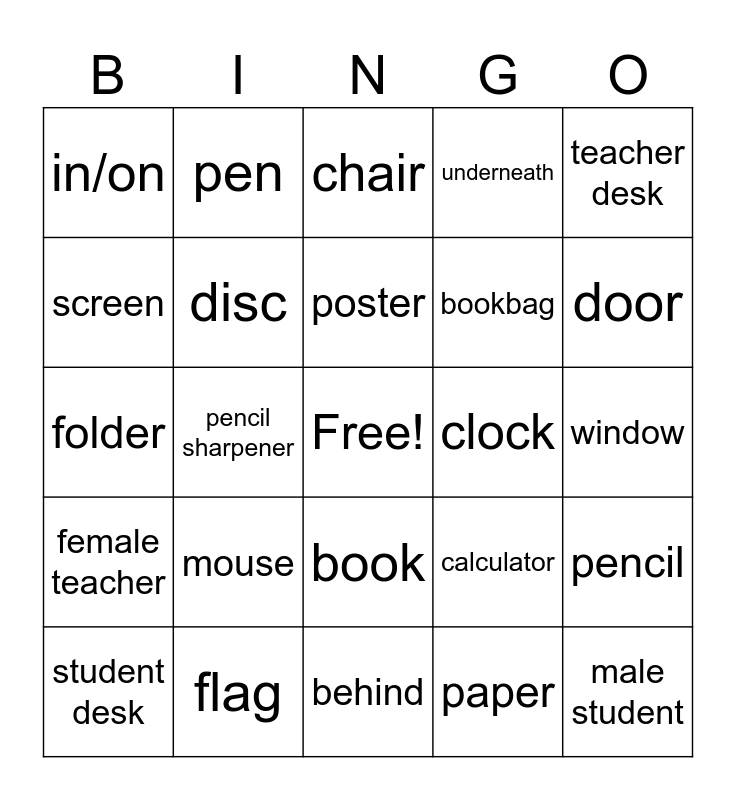 This bingo card has a free space and 24 words: mouse, flag, poster, student desk, teacher desk, in/on, screen, pen, clock, book, bookbag, folder, calculator, pencil, disc, paper, window, chair, door, pencil sharpener, male student, female teacher, underneath and behind.