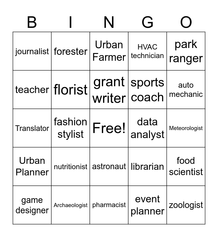 This bingo card has a free space and 49 words: electrician, zoologist, speech therapist, pharmacist, nutritionist, museum curator, forester, fitness instructor, teacher, packaging engineer, florist, HVAC technician, food scientist, librarian, chef de cuisine, esthetician, grant writer, data analyst, social media marketer, park ranger, fashion stylist, event planner, journalist, sports coach, real estate agent, auto mechanic, game designer, occupational therapist, astronaut, Urban Planner, Genetic Counselor, Environmental Scientist, Speech Therapist, Cybersecurity Analyst, Archaeologist, Marine Biologist, Forensic Scientist, Art Conservator, Meteorologist, Epidemiologist, Robotics Engineer, Dietitian, Animator, Audiologist, Translator, Urban Farmer, Sound Engineer, Renewable Energy Technician and electrician, zoologist, speech therapist, pharmacist, nutritionist, museum curator, forester, fitness instructor, teacher, packaging engineer, florist, HVAC technician, food scientist, librarian, chef de cuisine, esthetician, grant writer, data a.