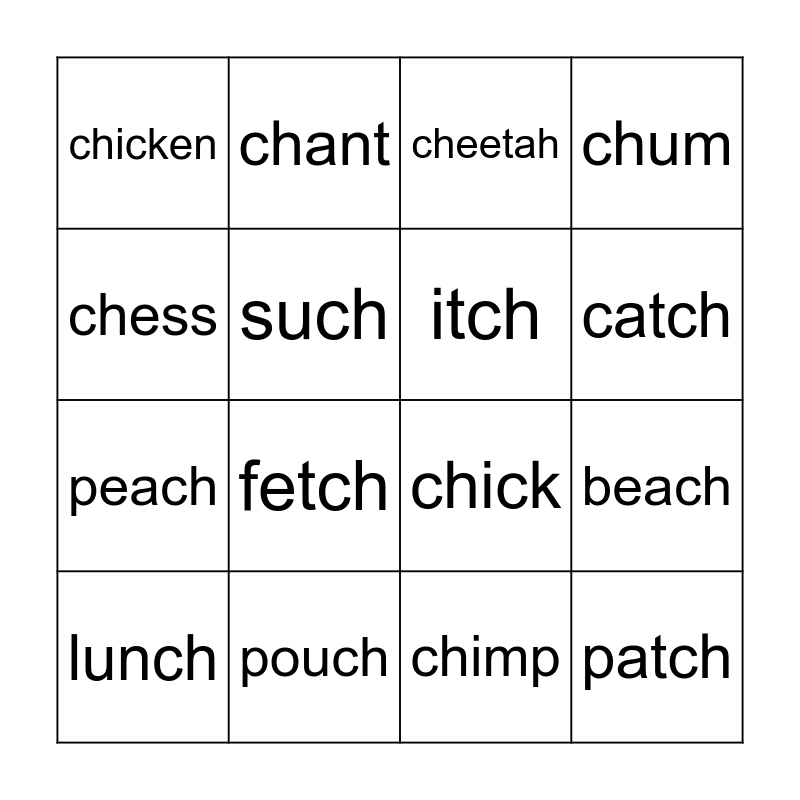 This bingo card has 16 words: pouch, beach, cheetah, chicken, peach, chant, chick, chimp, chess, such, lunch, chum, fetch, catch, itch and patch.