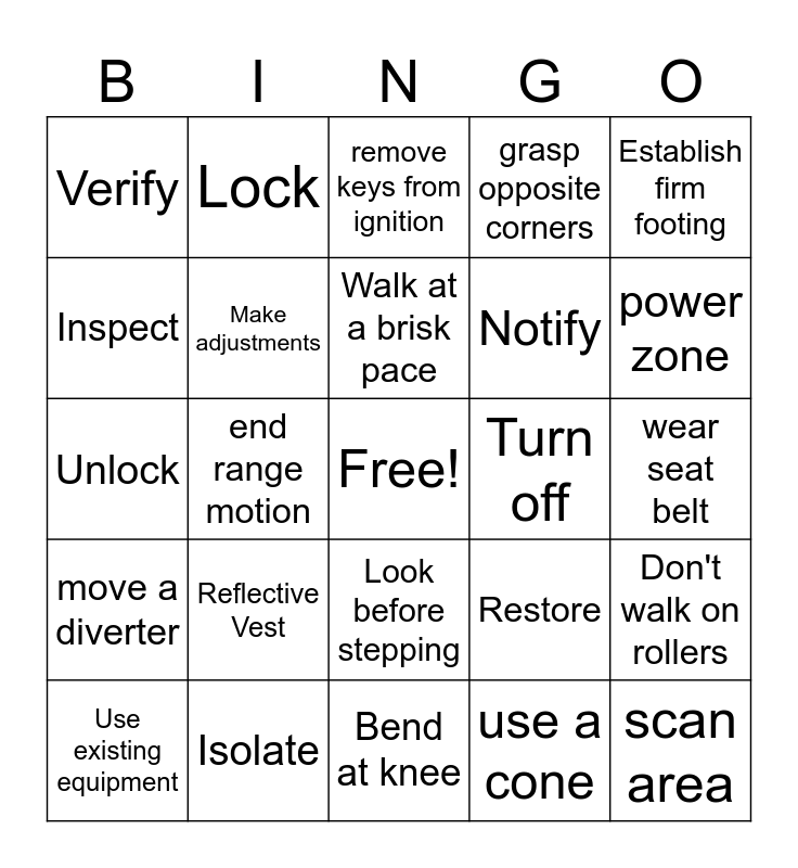 This bingo card has a free space and 24 words: Reflective Vest, Isolate, Walk at a brisk pace, Use existing equipment, Establish firm footing, Verify, Inspect, Lock, Turn off, Look before stepping, Notify, Unlock, Restore, Don't walk on rollers, Make adjustments, use a cone, wear seat belt, remove keys from ignition, power zone, end range motion, scan area, move a diverter, grasp opposite corners and Bend at knee.