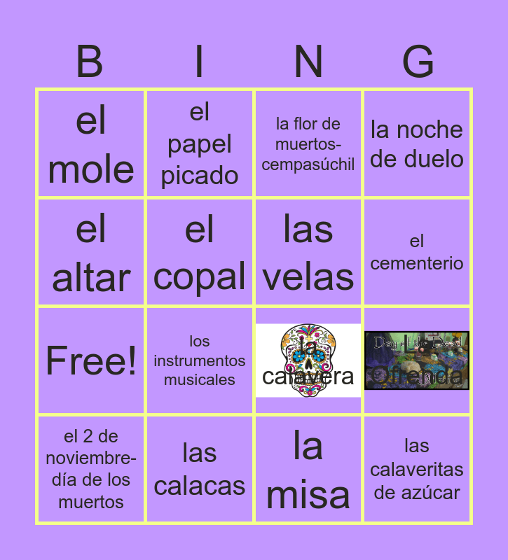 This bingo card has 4 images and 20 words: La Ofrenda, el chapulín, la flor de muertos-cempasúchil, El pan de muerto, el 2 de noviembre-día de los muertos, el altar, las calacas, el mole, Free!, el papel picado, los instrumentos musicales, la calavera, el copal, las calaveritas de azúcar, las velas, la Catrina, el cementerio, la noche de duelo, la misa and el día de preparación-el 31 de octubre.
