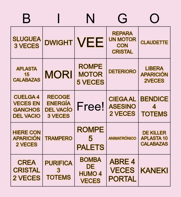 This bingo card has a free space and 24 words: TRAMPERO, PURIFICA 3 TOTEMS, ROMPE MOTOR 5 VECES, CREA CRISTAL 2 VECES, CLAUDETTE, SLUGUEA 3 VECES, APLASTA 15 CALABAZAS, DWIGHT, CIEGA AL ASESINO 2 VECES, ROMPE 5 PALETS, DETERIORO, CUELGA 4 VECES EN GANCHOS DEL VACIO, ANIMATRÓNICO, DE KILLER APLASTA 10 CALABAZAS, MORI, ABRE 4 VECES PORTAL, BENDICE 4 TOTEMS, VEE, LIBERA APARICIÓN 2VECES, RECOGE ENERGÍA DEL VACÍO 3 VECES, KANEKI, HIERE CON APARICIÓN 2 VECES, REPARA UN MOTOR CON CRISTAL and BOMBA DE HUMO 4 VECES.