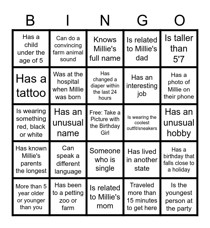 This bingo card has a free space and 24 words: Can speak a different language, Has been to a petting zoo or farm, Has changed a diaper within the last 24 hours, More than 5 year older or younger than you, Is taller than 5'7, Has a child under the age of 5, Has a tattoo, Can do a convincing farm animal sound, Is wearing the coolest outfit/sneakers, Someone who is single, Has an interesting job, Is wearing something red, black or white, Has lived in another state, Has a birthday that falls close to a holiday, Was at the hospital when Millie was born, Traveled more than 15 minutes to get here, Has an unusual hobby, Knows Millie's full name, Has a photo of Millie on their phone, Has an unusual name, Is the youngest person at the party, Has known Millie's parents the longest, Is related to Millie's dad and Is related to Millie's mom.
