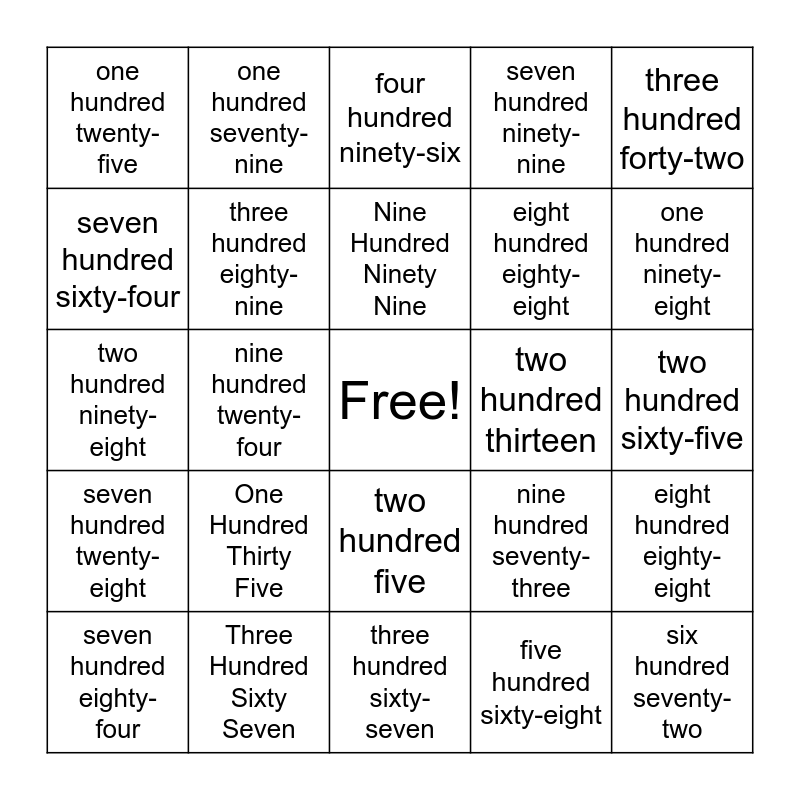 This bingo card has a free space and 24 words: One Hundred Thirty Five, Three Hundred Sixty Seven, Nine Hundred Ninety Nine, seven hundred eighty-four, three hundred forty-two, one hundred twenty-five, seven hundred sixty-four, one hundred seventy-nine, two hundred thirteen, two hundred five, eight hundred eighty-eight, two hundred ninety-eight, nine hundred seventy-three, eight hundred eighty-eight, three hundred eighty-nine, five hundred sixty-eight, two hundred sixty-five, four hundred ninety-six, one hundred ninety-eight, nine hundred twenty-four, six hundred seventy-two, seven hundred twenty-eight, seven hundred ninety-nine and three hundred sixty-seven.