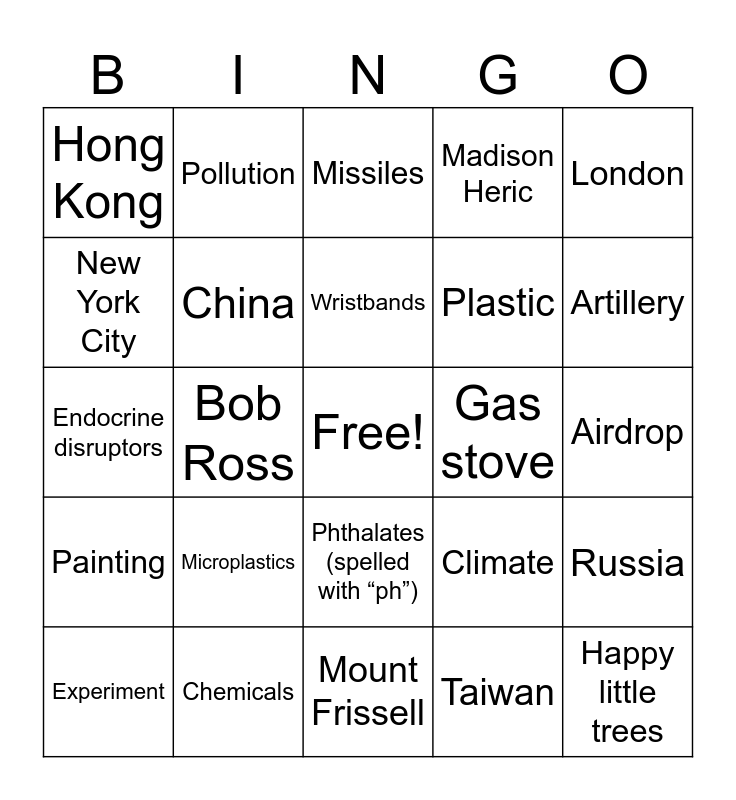 This bingo card has a free space and 24 words: Microplastics, Chemicals, Wristbands, Experiment, London, Hong Kong, New York City, Pollution, Gas stove, Phthalates (spelled with “ph”), Plastic, Endocrine disruptors, Climate, Russia, China, Taiwan, Airdrop, Missiles, Artillery, Bob Ross, Happy little trees, Painting, Madison Heric and Mount Frissell.