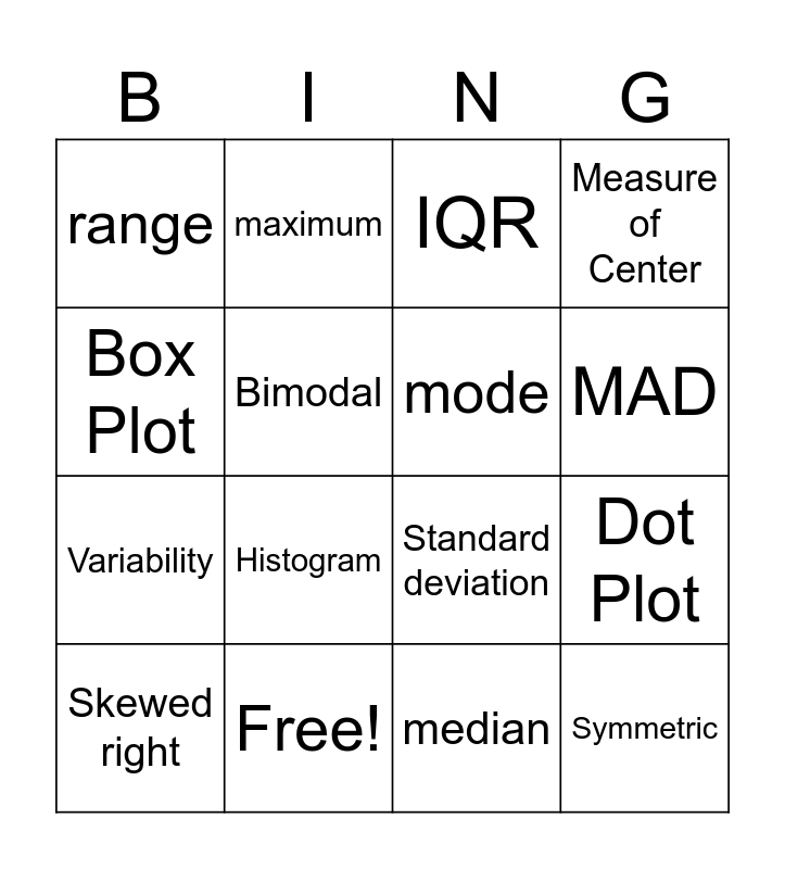 This bingo card has 21 words: Free!, minimum, maximum, mean, median, mode, range, IQR, Standard deviation, MAD, Variability, Measure of Center, Symmetric, Uniform, Bimodal, Skewed left, Skewed right, Histogram, Box Plot, Dot Plot and Outliers.