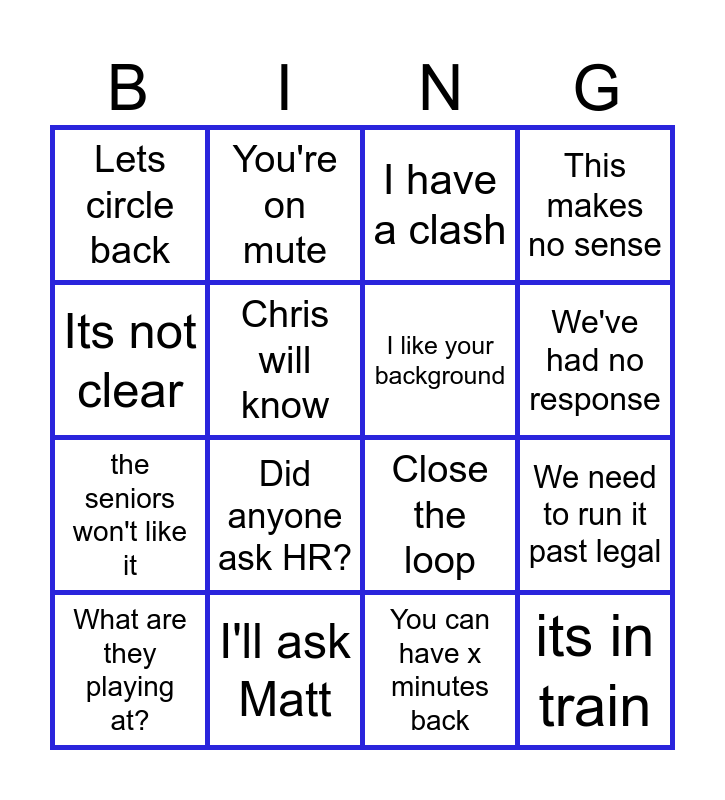 This bingo card has 16 words: I'll ask Matt, We need to run it past legal, I have a clash, Lets circle back, the seniors won't like it, You're on mute, Close the loop, You can have x minutes back, Its not clear, Chris will know, What are they playing at?, This makes no sense, Did anyone ask HR?, We've had no response, I like your background and its in train.