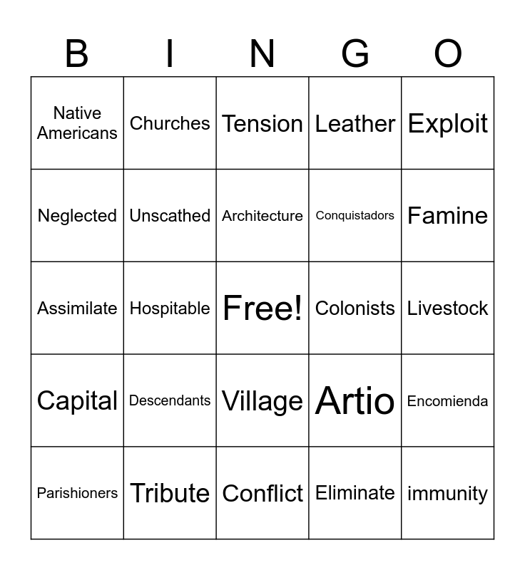 This bingo card has a free space and 35 words: Missionaries, Christians, Kivas, Unscathed, Village, Leather, Neglected, Ruins, Architecture, Convert, Assimilate, Exploit, New Spain, Mexico, Native Americans, Colonists, Eliminate, Hospitable, Capital, immunity, Artio, Parishioners, Encomienda, Tribute, Tension, Famine, Aftermath, Preserved, Conquistadors, Livestock, Disease, Conflict, Descendants, Churches and Casualties.