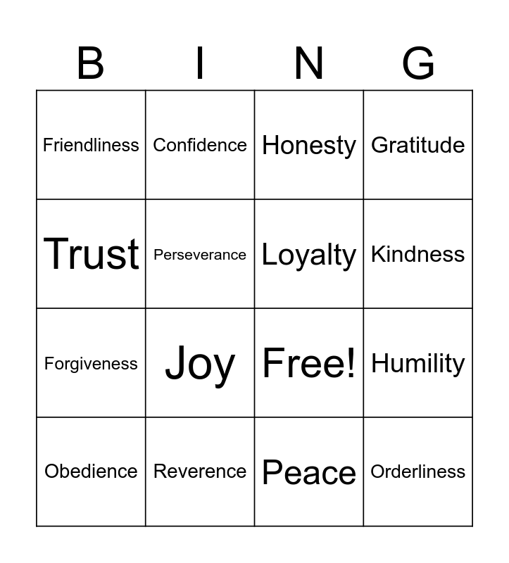 This bingo card has 21 words: Reverence, Holiness, Confidence, Self-Control, Peace, Loyalty, Friendliness, Honesty, Free!, Kindness, Forgiveness, Gratitude, Orderliness, Dependability, Perseverance, Initiative, Obedience, Joy, Trust, Humility and Compassion.