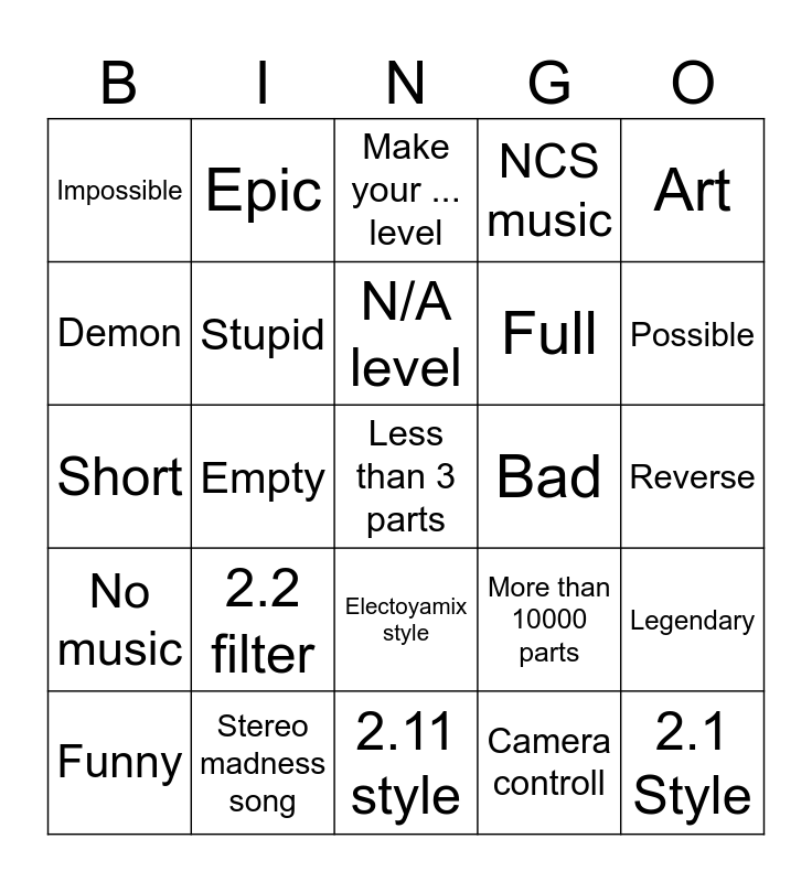 This bingo card has a free space and 24 words: 2.2 filter, Stereo madness song, N/A level, Funny, Art, Impossible, Demon, Epic, Bad, Electoyamix style, Full, Short, More than 10000 parts, Legendary, Stupid, Camera controll, Reverse, Make your ... level, Possible, Empty, 2.1 Style, No music, NCS music and 2.11 style.