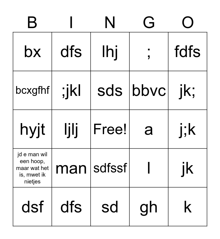 This bingo card has a free space and 24 words: man, dfs, sds, dsf, fdfs, bx, bcxgfhf, dfs, a, sdfssf, bbvc, hyjt, l, jk, ;jkl, gh, j;k, lhj, jk;, ljlj, k, jd e man wil een hoop, maar wat het is, mwet ik nietjes, ; and sd.