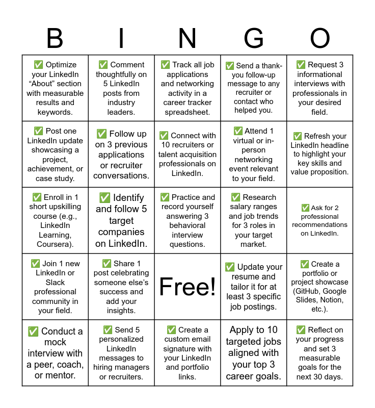This bingo card has 26 words: Free!, Apply to 10 targeted jobs aligned with your top 3 career goals., ✅ Connect with 10 recruiters or talent acquisition professionals on LinkedIn., ✅ Send 5 personalized LinkedIn messages to hiring managers or recruiters., ✅ Request 3 informational interviews with professionals in your desired field., ✅ Optimize your LinkedIn “About” section with measurable results and keywords., ✅ Post one LinkedIn update showcasing a project, achievement, or case study., ✅ Comment thoughtfully on 5 LinkedIn posts from industry leaders., ✅ Ask for 2 professional recommendations on LinkedIn., ✅ Update your resume and tailor it for at least 3 specific job postings., ✅ Attend 1 virtual or in-person networking event relevant to your field., ✅ Enroll in 1 short upskilling course (e.g., LinkedIn Learning, Coursera)., ✅ Create a portfolio or project showcase (GitHub, Google Slides, Notion, etc.)., ✅ Conduct a mock interview with a peer, coach, or mentor., ✅ Identify and follow 5 target companies on LinkedIn., ✅ Write and post a short article or reflection on LinkedIn about your industry insights., ✅ Send a thank-you follow-up message to any recruiter or contact who helped you., ✅ Join 1 new LinkedIn or Slack professional community in your field., ✅ Track all job applications and networking activity in a career tracker spreadsheet., ✅ Practice and record yourself answering 3 behavioral interview questions., ✅ Refresh your LinkedIn headline to highlight your key skills and value proposition., ✅ Create a custom email signature with your LinkedIn and portfolio links., ✅ Research salary ranges and job trends for 3 roles in your target market., ✅ Share 1 post celebrating someone else’s success and add your insights., ✅ Follow up on 3 previous applications or recruiter conversations. and ✅ Reflect on your progress and set 3 measurable goals for the next 30 days..