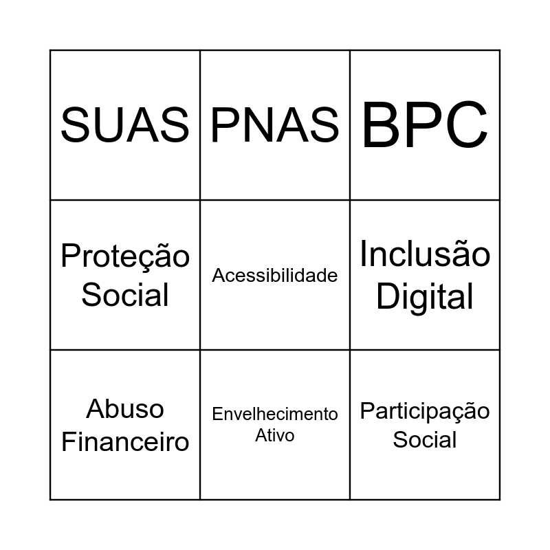 This bingo card has 9 words: Abuso Financeiro, BPC, PNAS, Proteção Social, SUAS, Inclusão Digital, Acessibilidade, Participação Social and Envelhecimento Ativo.