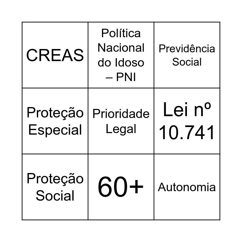 This bingo card has 9 words: Proteção Social, Previdência Social, Política Nacional do Idoso – PNI, Proteção Especial, CREAS, Lei nº 10.741, Prioridade Legal, Autonomia and 60+.