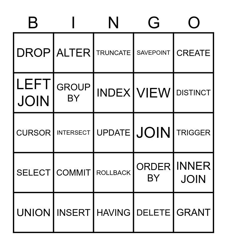 This bingo card has 25 words: SELECT, INSERT, UPDATE, DELETE, CREATE, DROP, ALTER, TRUNCATE, JOIN, INNER JOIN, LEFT JOIN, GROUP BY, HAVING, ORDER BY, DISTINCT, UNION, INTERSECT, INDEX, VIEW, TRIGGER, CURSOR, COMMIT, ROLLBACK, SAVEPOINT and GRANT.
