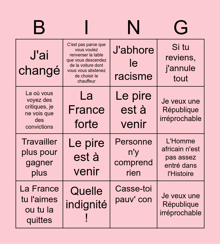 This bingo card has 17 words: Casse-toi pauv' con, La France tu l'aimes ou tu la quittes, J'abhore le racisme, J'ai changé, Le pire est à venir, Si tu reviens, j'annule tout, L'Homme africain n'est pas assez entré dans l'Histoire, Le pire est à venir, Je veux une République irréprochable, La France forte, Quelle indignité !, Personne n'y comprend rien, La où vous voyez des critiques, je ne vois que des convictions, C'est pas parce que vous voulez renverser la table que vous descendez de la voiture dont vous vous abstenez de choisir le chauffeur, Travailler plus pour gagner plus, Si la vérité blesse, c'est la faute de la vérité and Je veux une République irréprochable.