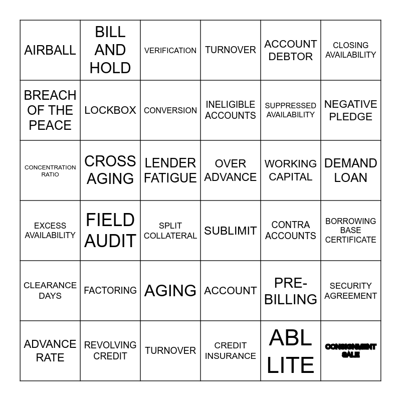 This bingo card has 36 words: ACCOUNT, AGING, CREDIT INSURANCE, BREACH OF THE PEACE, EXCESS AVAILABILITY, OVER ADVANCE, LOCKBOX, TURNOVER, ACCOUNT DEBTOR, PRE-BILLING, NEGATIVE PLEDGE, TURNOVER, SECURITY AGREEMENT, CROSS AGING, INELIGIBLE ACCOUNTS, AIRBALL, CLEARANCE DAYS, WORKING CAPITAL, CONCENTRATION RATIO, VERIFICATION, LENDER FATIGUE, FIELD AUDIT, SUBLIMIT, SPLIT COLLATERAL, CONTRA ACCOUNTS, BILL AND HOLD, SUPPRESSED AVAILABILITY, REVOLVING CREDIT, CONVERSION, CLOSING AVAILABILITY, CONSIGNMENT SALE, ADVANCE RATE, BORROWING BASE CERTIFICATE, DEMAND LOAN, FACTORING and ABL LITE.