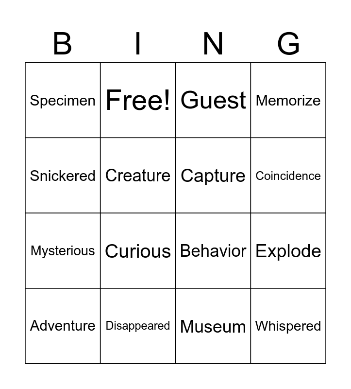 This bingo card has 19 words: Behavior, Field Trip, Guest, Whispered, Explode, Snickered, Museum, Specimen, Free!, Mysterious, Curious, Creature, Capture, Disappeared, Adventure, Dangerous, Memorize, Coincidence and Pondered.