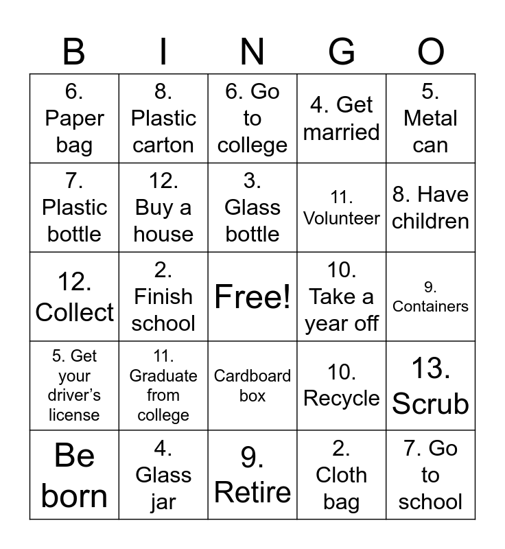 This bingo card has a free space and 26 words: Cardboard box, 2. Cloth bag, 3. Glass bottle, 4. Glass jar, 5. Metal can, 6. Paper bag, 7. Plastic bottle, 8. Plastic carton, 9. Containers, 10. Recycle, 11. Volunteer, 12. Collect, 13. Scrub, Be born, 2. Finish school, 3. Get a job, 4. Get married, 5. Get your driver’s license, 6. Go to college, 7. Go to school, 8. Have children, 9. Retire, 10. Take a year off, 11. Graduate from college, 12. Buy a house and 13. Immigrate.