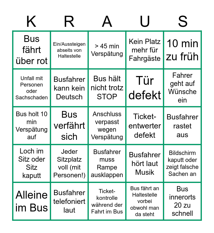This bingo card has a free space and 24 words: Jeder Sitzplatz voll (mit Personen!), Busfahrer telefoniert laut, Bus hält nicht trotz STOP, Alleine im Bus, 10 min zu früh, Bus fährt über rot, Unfall mit Personen oder Sachschaden, Ein/Aussteigen abseits von Haltestelle, Ticket-entwerter defekt, Busfahrer muss Rampe ausklappen, Tür defekt, Bus holt 10 min Verspätung auf, Busfahrer hört laut Musik, Bildschirm kaputt oder zeigt falsche Sachen an, Busfahrer kann kein Deutsch, Bus fährt an Haltestelle vorbei obwohl man da steht, Busfahrer rastet aus, > 45 min Verspätung, Fahrer geht auf Wünsche ein, Bus verfährt sich, Bus innerorts 20 zu schnell, Loch im Sitz oder Sitz kaputt, Kein Platz mehr für Fahrgäste and Ticket-kontrolle während der Fahrt im Bus.