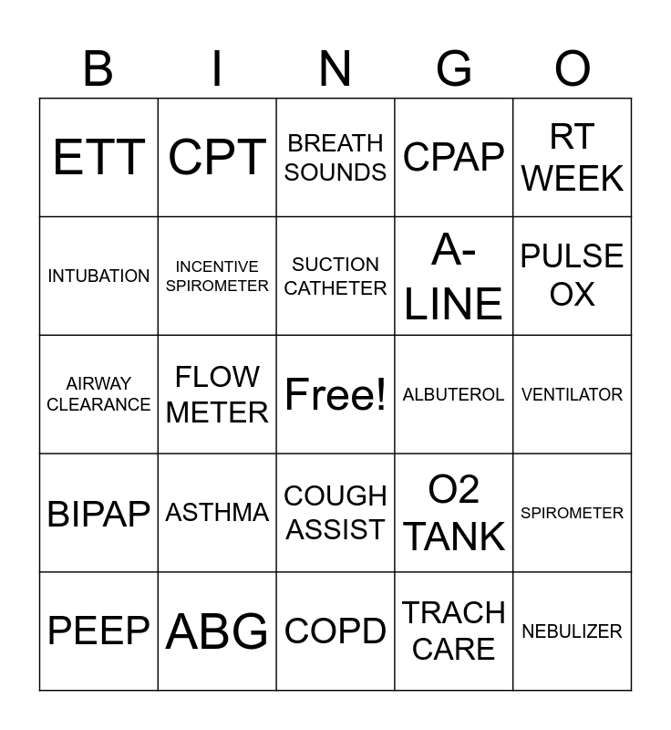 This bingo card has a free space and 24 words: ASTHMA, ABG, SUCTION CATHETER, PEEP, RT WEEK, ETT, INTUBATION, CPT, ALBUTEROL, COUGH ASSIST, A-LINE, AIRWAY CLEARANCE, O2 TANK, SPIROMETER, INCENTIVE SPIROMETER, TRACH CARE, VENTILATOR, BREATH SOUNDS, PULSE OX, FLOW METER, NEBULIZER, BIPAP, CPAP and COPD.