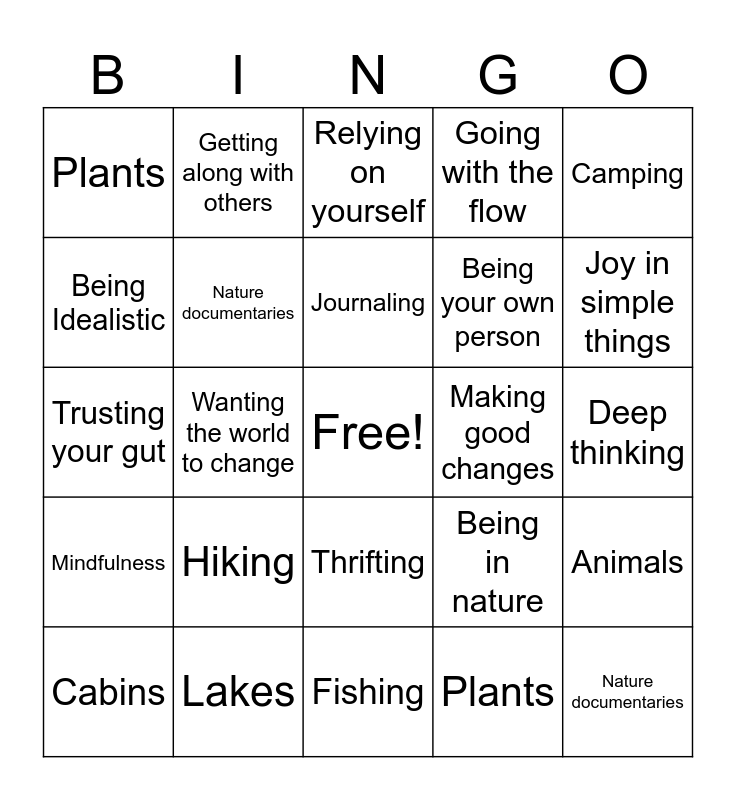 This bingo card has a free space and 24 words: Hiking, Lakes, Journaling, Cabins, Camping, Plants, Being Idealistic, Getting along with others, Making good changes, Thrifting, Being your own person, Trusting your gut, Being in nature, Animals, Nature documentaries, Plants, Deep thinking, Relying on yourself, Joy in simple things, Wanting the world to change, Nature documentaries, Mindfulness, Going with the flow and Fishing.