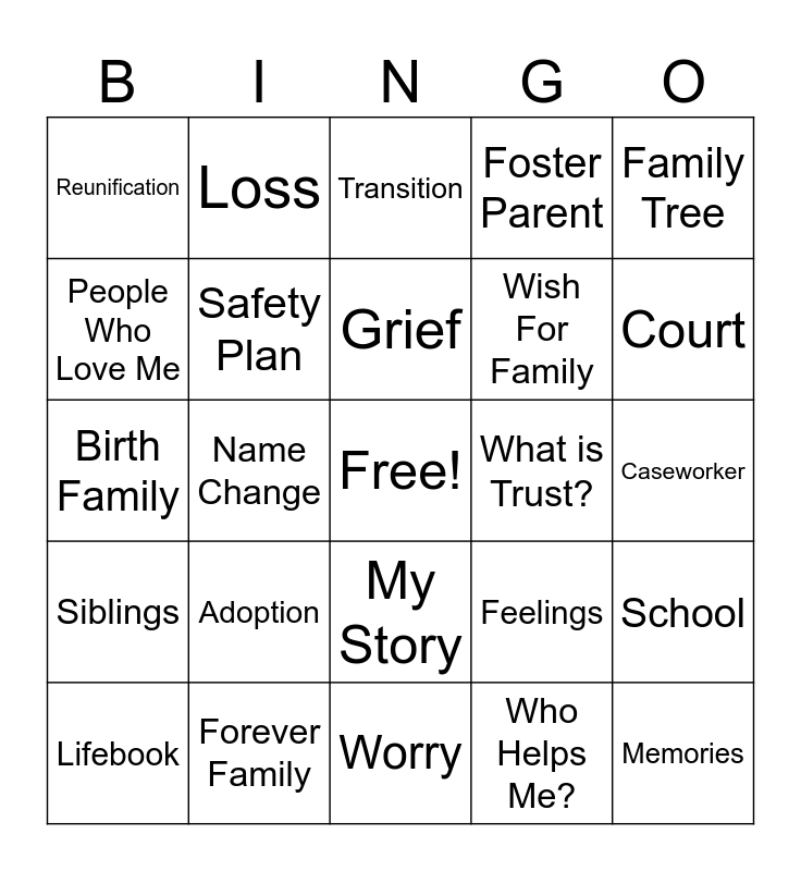This bingo card has a free space and 24 words: Adoption, Forever Family, Grief, Lifebook, Family Tree, Reunification, People Who Love Me, Loss, What is Trust?, My Story, Wish For Family, Birth Family, Feelings, School, Safety Plan, Who Helps Me?, Caseworker, Transition, Court, Name Change, Memories, Siblings, Foster Parent and Worry.