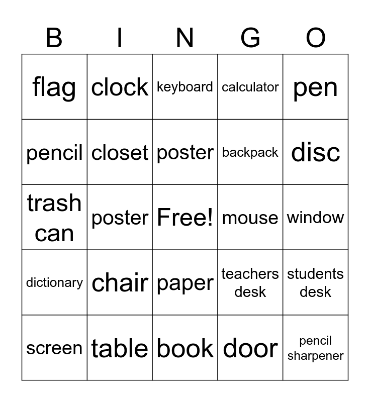 This bingo card has a free space and 24 words: chair, table, poster, screen, pen, flag, pencil, clock, mouse, paper, backpack, trash can, teachers desk, students desk, closet, door, window, keyboard, disc, poster, pencil sharpener, dictionary, calculator and book.