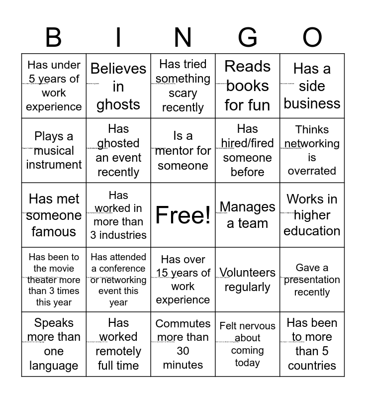 This bingo card has 24 images, a free space and 24 words: Has attended a conference or networking event this year, Has worked remotely full time, Is a mentor for someone, Speaks more than one language, Has a side business, Has under 5 years of work experience, Plays a musical instrument, Believes in ghosts, Manages a team, Has over 15 years of work experience, Has hired/fired someone before, Has met someone famous, Volunteers regularly, Gave a presentation recently, Has ghosted an event recently, Felt nervous about coming today, Works in higher education, Has tried something scary recently, Thinks networking is overrated, Has worked in more than 3 industries, Has been to more than 5 countries, Has been to the movie theater more than 3 times this year, Reads books for fun and Commutes more than 30 minutes.