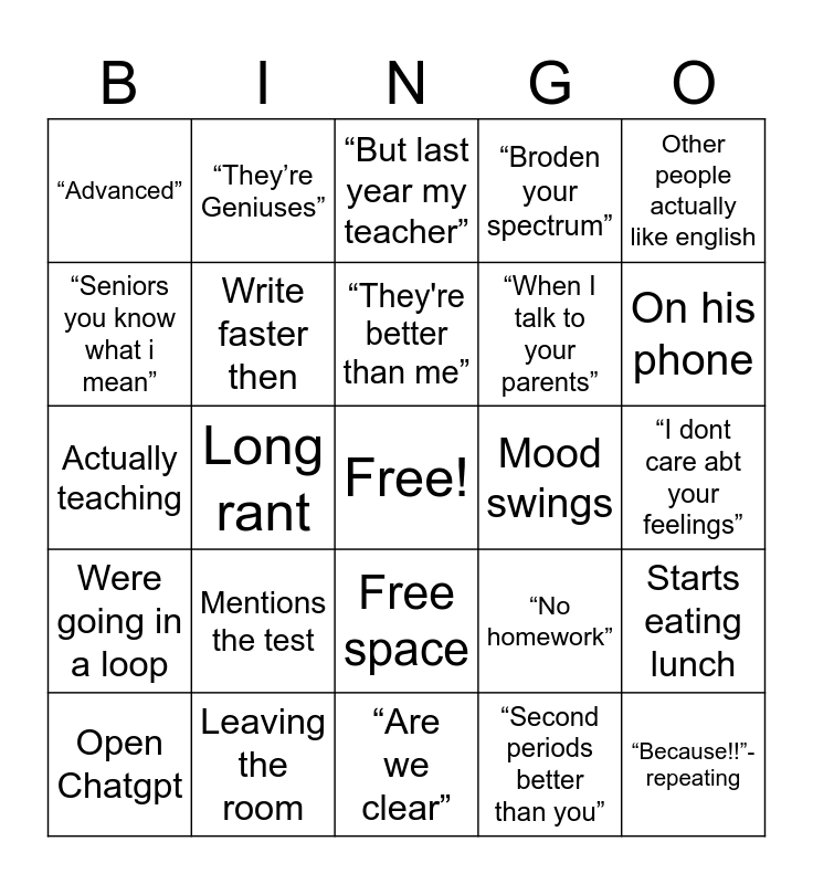 This bingo card has a free space and 33 words: Thats Inaccurate, My kids doing sports, Long rant, You don't make sense, Were going in a loop, Write faster then, Other people actually like english, Open Chatgpt, “They’re Geniuses”, “Meet me on ___”, “They're better than me”, “But last year my teacher”, “But im just a kid”, A joke 😮, Mood swings, On his phone, Leaving the room, Actually teaching, Mentions the test, “No homework”, Free space, Random tangent, “Advanced”, “I dont care abt your feelings”, “Are we clear”, “Because!!”- repeating, “Broden your spectrum”, “When I talk to your parents”, “Seniors you know what i mean”, Starts eating lunch, Fifth periods worse than you, “Second periods better than you” and You guys suck.