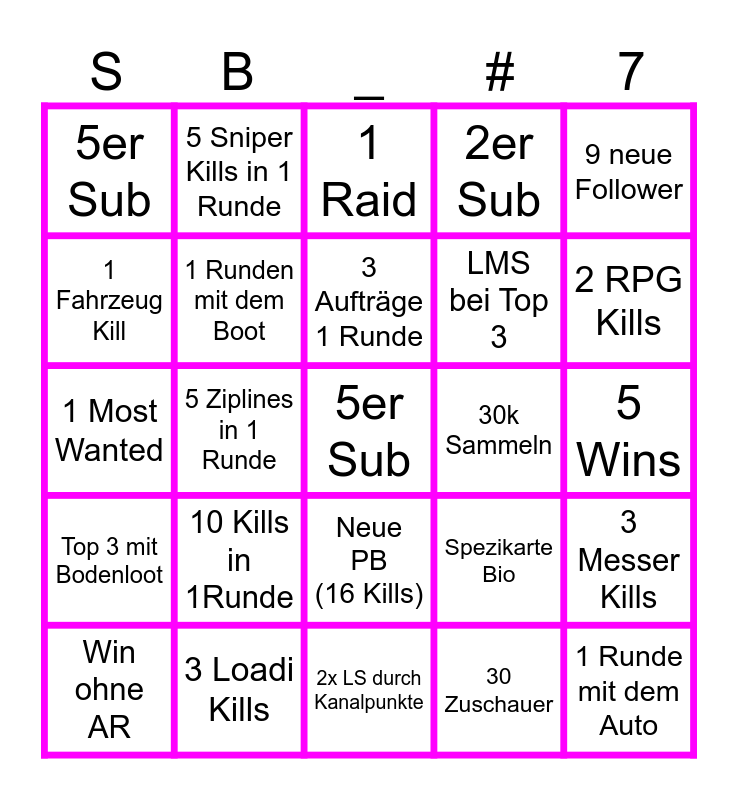 This bingo card has a free space and 24 words: 10 Kills in 1Runde, 3 Loadi Kills, 3 Aufträge 1 Runde, Win ohne AR, 9 neue Follower, 5er Sub, 1 Fahrzeug Kill, 5 Sniper Kills in 1 Runde, 30k Sammeln, Neue PB (16 Kills), LMS bei Top 3, 1 Most Wanted, Spezikarte Bio, 3 Messer Kills, 1 Runden mit dem Boot, 30 Zuschauer, 5 Wins, 1 Raid, 2 RPG Kills, 5 Ziplines in 1 Runde, 1 Runde mit dem Auto, Top 3 mit Bodenloot, 2er Sub and 2x LS durch Kanalpunkte.