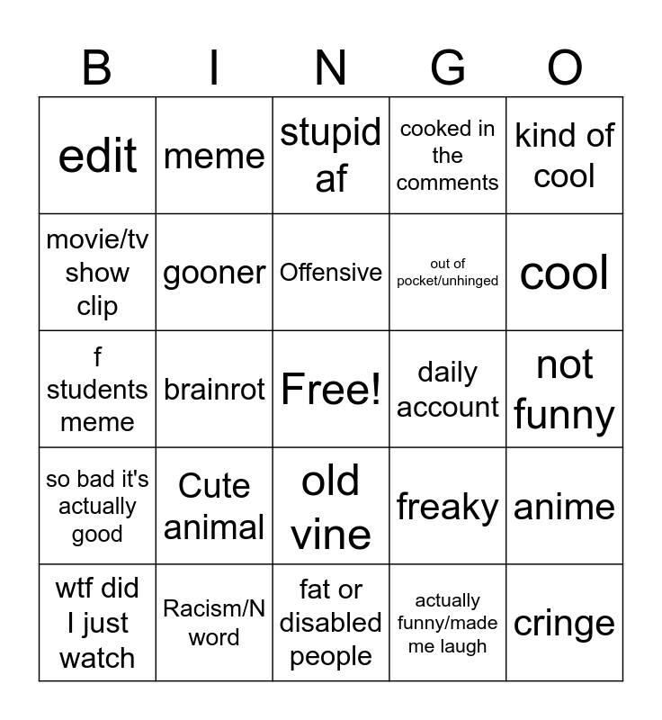 This bingo card has a free space and 24 words: Cute animal, Racism/N word, Offensive, wtf did I just watch, kind of cool, edit, movie/tv show clip, meme, daily account, old vine, out of pocket/unhinged, f students meme, freaky, anime, gooner, actually funny/made me laugh, not funny, stupid af, cool, brainrot, cringe, so bad it's actually good, cooked in the comments and fat or disabled people.