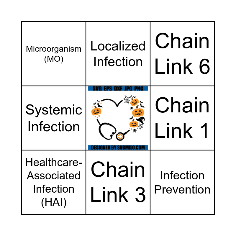 This bingo card has a free space and 8 words: Chain Link 1, Chain Link 6, Localized Infection, Healthcare-Associated Infection (HAI), Microorganism (MO), Infection Prevention, Systemic Infection and Chain Link 3.