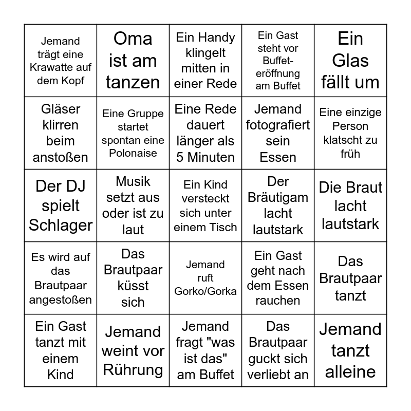 This bingo card has 25 words: Das Brautpaar küsst sich, Jemand fragt "was ist das" am Buffet, Eine Rede dauert länger als 5 Minuten, Ein Gast tanzt mit einem Kind, Ein Glas fällt um, Jemand trägt eine Krawatte auf dem Kopf, Gläser klirren beim anstoßen, Oma ist am tanzen, Der Bräutigam lacht lautstark, Jemand ruft Gorko/Gorka, Jemand fotografiert sein Essen, Der DJ spielt Schlager, Ein Gast geht nach dem Essen rauchen, Das Brautpaar tanzt, Eine Gruppe startet spontan eine Polonaise, Jemand tanzt alleine, Die Braut lacht lautstark, Ein Handy klingelt mitten in einer Rede, Eine einzige Person klatscht zu früh, Musik setzt aus oder ist zu laut, Ein Kind versteckt sich unter einem Tisch, Jemand weint vor Rührung, Es wird auf das Brautpaar angestoßen, Ein Gast steht vor Buffet- eröffnung am Buffet and Das Brautpaar guckt sich verliebt an.