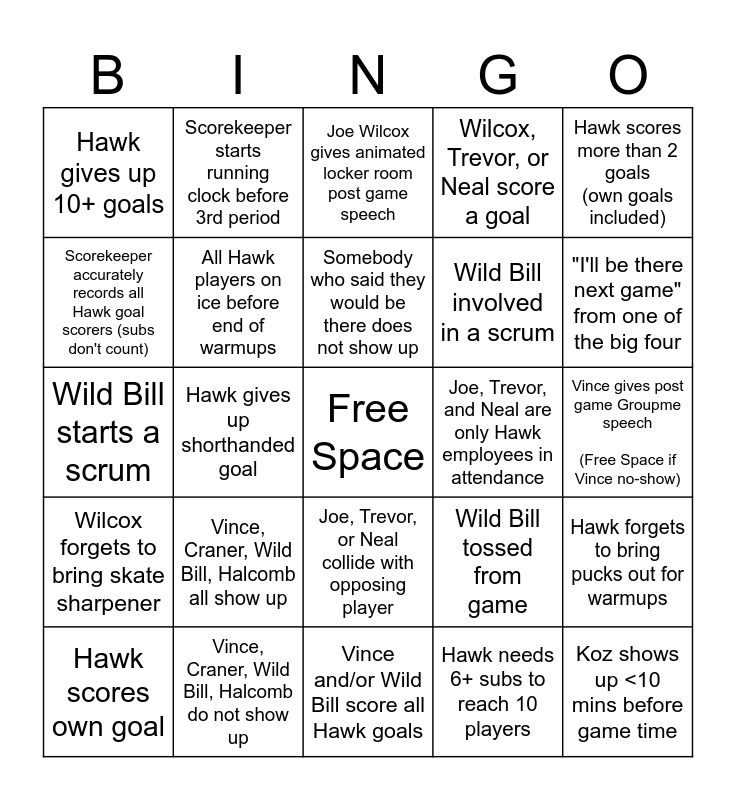 This bingo card has a free space and 24 words: Vince, Craner, Wild Bill, Halcomb all show up, Vince, Craner, Wild Bill, Halcomb do not show up, Somebody who said they would be there does not show up, Hawk scores own goal, Hawk scores more than 2 goals (own goals included), Hawk gives up 10+ goals, Scorekeeper accurately records all Hawk goal scorers (subs don't count), Scorekeeper starts running clock before 3rd period, Joe, Trevor, and Neal are only Hawk employees in attendance, Joe, Trevor, or Neal collide with opposing player, Wild Bill involved in a scrum, Wild Bill starts a scrum, Wild Bill tossed from game, Hawk forgets to bring pucks out for warmups, All Hawk players on ice before end of warmups, Hawk needs 6+ subs to reach 10 players, Vince gives post game Groupme speech (Free Space if Vince no-show), Joe Wilcox gives animated locker room post game speech, "I'll be there next game" from one of the big four, Hawk gives up shorthanded goal, Koz shows up <10 mins before game time, Wilcox forgets to bring skate sharpener, Wilcox, Trevor, or Neal score a goal and Vince and/or Wild Bill score all Hawk goals.