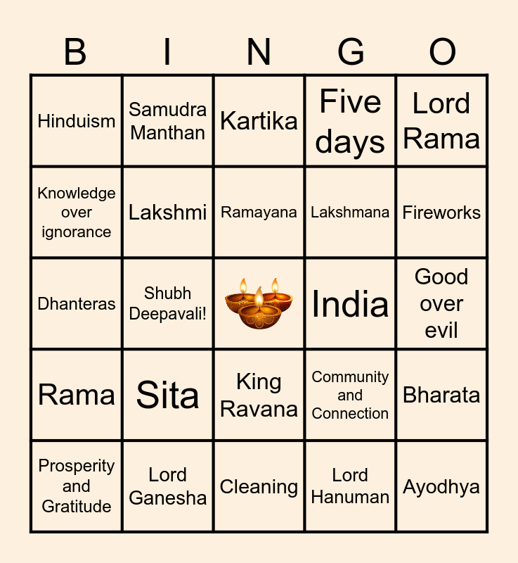 This bingo card has a free space and 39 words: Puja, New Beginnings, Harvest season, Lakshmi, Prosperity and Gratitude, King Ravana, Ramayana, Rangoli, Lord Rama, Rama, Shubh Deepavali!, Five days, Ayodhya, Good over evil, India, Sita, Festival of lights, Hinduism, Light Over Darkness, Community and Connection, Knowledge over ignorance, Cleaning, Lakshmana, Fireworks, CA state holiday, King Dasharatha, Decorations, Sweets, Gifts, Samudra Manthan, Lord Krishna, Narakasura, Kartika, Lord Ganesha, Lord Hanuman, Queen Kaikeyi, Bharata, Dhanteras and Kali Chaudas.
