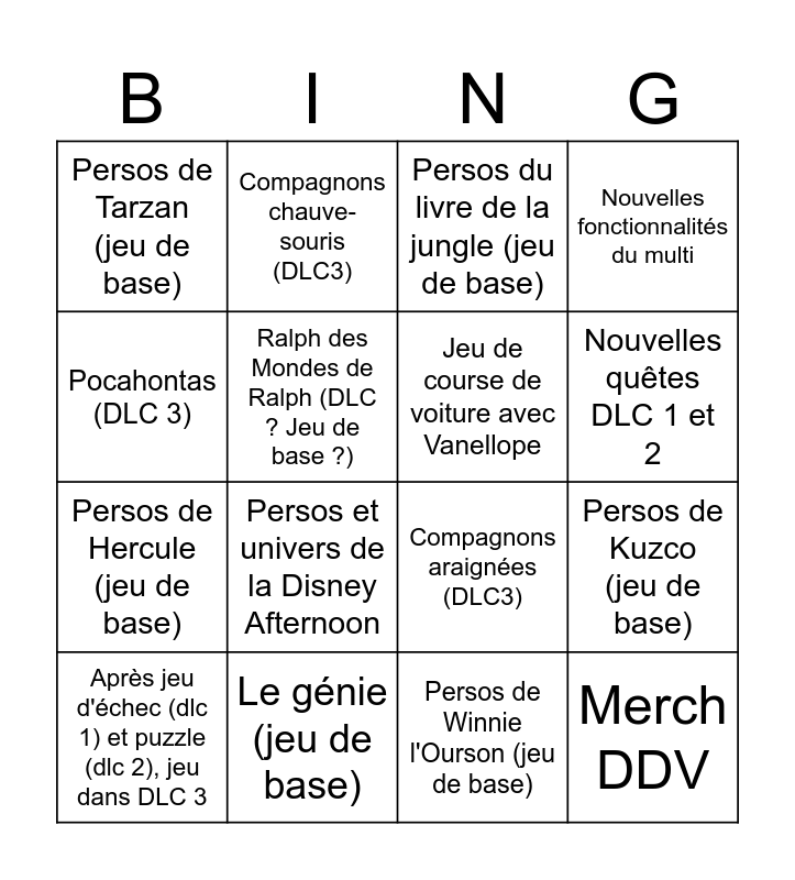 This bingo card has 16 words: Le génie (jeu de base), Persos de Kuzco (jeu de base), Persos du livre de la jungle (jeu de base), Persos de Tarzan (jeu de base), Persos de Hercule (jeu de base), Compagnons chauve-souris (DLC3), Compagnons araignées (DLC3), Persos de Winnie l'Ourson (jeu de base), Pocahontas (DLC 3), Ralph des Mondes de Ralph (DLC ? Jeu de base ?), Après jeu d'échec (dlc 1) et puzzle (dlc 2), jeu dans DLC 3, Nouvelles fonctionnalités du multi, Persos et univers de la Disney Afternoon, Nouvelles quêtes DLC 1 et 2, Jeu de course de voiture avec Vanellope and Merch DDV.