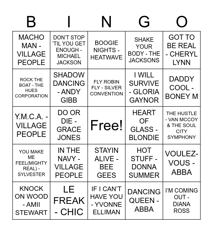 This bingo card has a free space and 54 words: YOUNG HEARTS RUN FREE - CANDI STATON, YOU MAKE ME FEEL(MIGHTY REAL) - SYLVESTER, WE ARE FAMILY - SISTER SLEDGE, SUPER FREAK - RICK JAMES, STAYIN ALIVE - BEE GEES, SHAKE YOUR GROOVE THING - PEACHES & HERB, SHAKE YOUR BODY - THE JACKSONS, ROCK YOU BABY - GEORGE MCCRAE, ROCK THE BOAT - THE HUES CORPORATION, RING MY BELL - ANITA WARD, MACHO MAN - VILLAGE PEOPLE, LOVE TRAIN - THE O’JAYS, LE FREAK - CHIC, KNOCK ON WOOD - AMII STEWART, IT’S RAINING MEN - THE WEATHER GIRLS, IF I CAN’T HAVE YOU - YVONNE ELLIMAN, I’M COMING OUT - DIANA ROSS, I WILL SURVIVE - GLORIA GAYNOR, I LOVE THE NIGHTLIFE(DISCO ‘ROUND) - ALICIA BRIDGES, THE HUSTLE - VAN MCCOY & THE SOUL CITY SYMPHONY, HOT STUFF - DONNA SUMMER, HEAVEN MUST BE MISSING AN ANGEL - TAVARES, HEART OF GLASS - BLONDIE, GOT TO BE REAL - CHERYL LYNN, FUNKYTOWN - LIPPS, INC., DON’T STOP ’TIL YOU GET ENOUGH - MICHAEL JACKSON, DON’T LEAVE ME THIS WAY - THELMA HOUSTON, DISCO INFERNO - THE TRAMMPS, DAZZ - BRICK, DANCING QUEEN - ABBA, DA YA THINK I’M SEXY - ROD STEWART, CELEBRATION - KOOL & THE GANG, BOOGIE WONDERLAND - EARTH, WIND & FIRE, BOOGIE OOGIE OOGIE - A TASTE OF HONEY, BOOGIE NIGHTS - HEATWAVE, YOU SEXY THING - HOT CHOCOLATE, Y.M.C.A. - VILLAGE PEOPLE, VOULEZ-VOUS - ABBA, THAT’S THE WAY(I LIKE IT) - KC AND THE SUNSHINE BAND, SHADOW DANCING - ANDY GIBB, SEPTEMBER - EARTH, WIND & FIRE, LOVE TO LOVE YOU BABY - DONNA SUMMER, LOVE MACHINE - THE MIRACLES, LADY(YOU BRING ME UP) - THE COMMODORES, IN THE NAVY - VILLAGE PEOPLE, THE GROOVE LINE - HEATWAVE, GET DOWN TONIGHT - KC AND THE SUNSHINE BAND, GET DOWN ON IT - KOOL & THE GANG, FLY ROBIN FLY - SILVER CONVENTION, DO OR DIE - GRACE JONES, DADDY COOL - BONEY M, BORN TO BE ALIVE - PATRICK HERNANDEZ, BEST OF MY LOVE - THE EMOTIONS and AND THE BEAT GOES ON - THE WHISPERS.