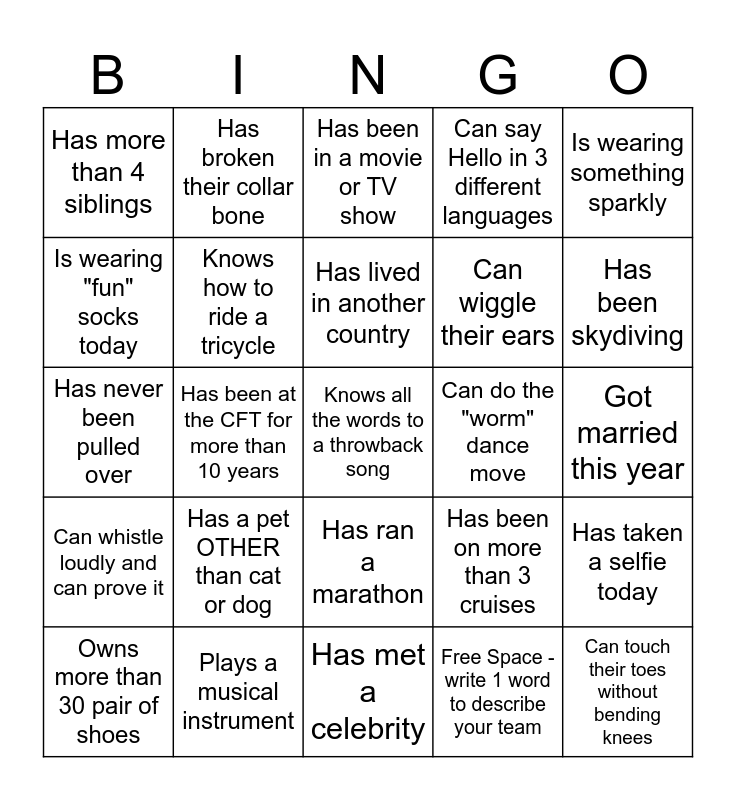 This bingo card has 25 words: Has a pet OTHER than cat or dog, Has met a celebrity, Has lived in another country, Owns more than 30 pair of shoes, Is wearing something sparkly, Has more than 4 siblings, Is wearing "fun" socks today, Has broken their collar bone, Can do the "worm" dance move, Has ran a marathon, Can wiggle their ears, Has never been pulled over, Has been on more than 3 cruises, Has taken a selfie today, Knows how to ride a tricycle, Can touch their toes without bending knees, Got married this year, Has been in a movie or TV show, Has been skydiving, Has been at the CFT for more than 10 years, Knows all the words to a throwback song, Plays a musical instrument, Can whistle loudly and can prove it, Can say Hello in 3 different languages and Free Space - write 1 word to describe your team.