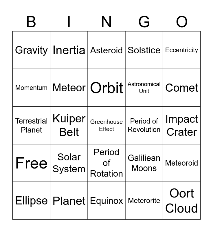This bingo card has a free space and 24 words: Solar System, Planet, Orbit, Ellipse, Eccentricity, Gravity, Momentum, Inertia, Period of Revolution, Period of Rotation, Astronomical Unit, Terrestrial Planet, Galiliean Moons, Meteoroid, Meteor, Meterorite, Impact Crater, Asteroid, Comet, Kuiper Belt, Oort Cloud, Free, Solstice and Equinox.