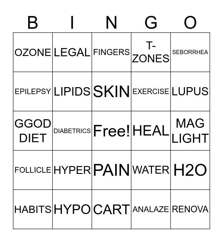 This bingo card has a free space and 24 words: HYPER, HYPO, SKIN, HABITS, SEBORRHEA, OZONE, EPILEPSY, LEGAL, HEAL, PAIN, EXERCISE, GGOD DIET, WATER, H2O, LIPIDS, ANALAZE, MAG LIGHT, FINGERS, LUPUS, DIABETRICS, RENOVA, FOLLICLE, T-ZONES and CART.