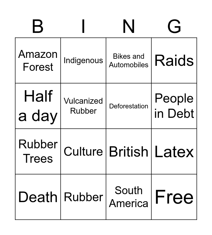 This bingo card has 16 words: Rubber, Latex, Bikes and Automobiles, Amazon Forest, Rubber Trees, Indigenous, British, South America, Half a day, Vulcanized Rubber, Death, Raids, Culture, People in Debt, Deforestation and Free.