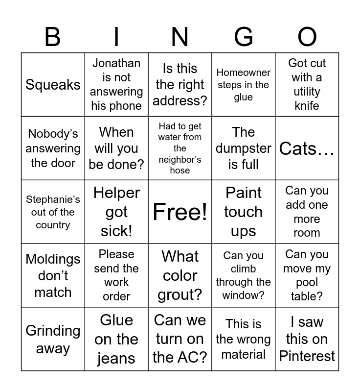 This bingo card has a free space and 54 words: Is the baseboard ready?, Moldings don’t match, Dog got out, Do you have a pet raccoon?, What color grout?, Please don’t use the restroom, Homeowner steps in the glue, This door doesn’t fit, Nobody’s answering the door, Nap Time, Squeaks, Hit a pipe, Glue on the jeans, Grinding away, Is this supposed to look like that?, Can we turn on the AC?, I saw this on Pinterest, The dumpster is full, We are going to be short, Can you add one more room, Can you climb through the window?, You missed a spot, Paint touch ups, Got cut with a utility knife, Courtney is still sleeping, Jonathan is not answering his phone, Lewanna forgot, Missing a transition piece, This is the wrong color, This is the wrong material, C&C can’t find the material, Can you pay me double?, Do you have 3,000 sq ft?, Do you have any more jobs?, Is this the right address?, You didn’t say it was going to be this dusty!, Stephanie’s out of the country, Can you move my pool table?, When can you start?, When will you be done?, Call Willie, Truck broke down, Stephanie’s not here, It’s not on the work order, Please send the work order, Saw died, Grinder burned up, No electricity!, Had to get water from the neighbor’s hose, Helper got sick!, Cats…, Pet Hair, etc., Keep your shirt on! and What is the gate code?.