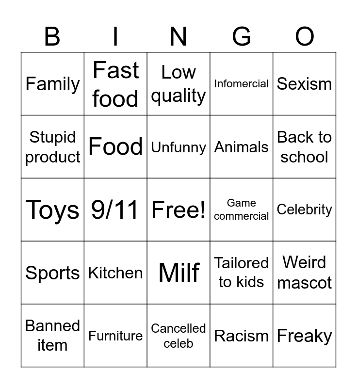 This bingo card has a free space and 29 words: Banned item, Insurance, 9/11, Offensive, Family, Low quality, Food, Kitchen, Game commercial, Furniture, Celebrity, Freaky, Cancelled celeb, Racism, Back to school, Cringe, Milf, Sports, Sexism, Toys, Tailored to kids, Cereal, Animals, Stupid product, Infomercial, Fast food, Weird mascot, Unfunny and Soda.