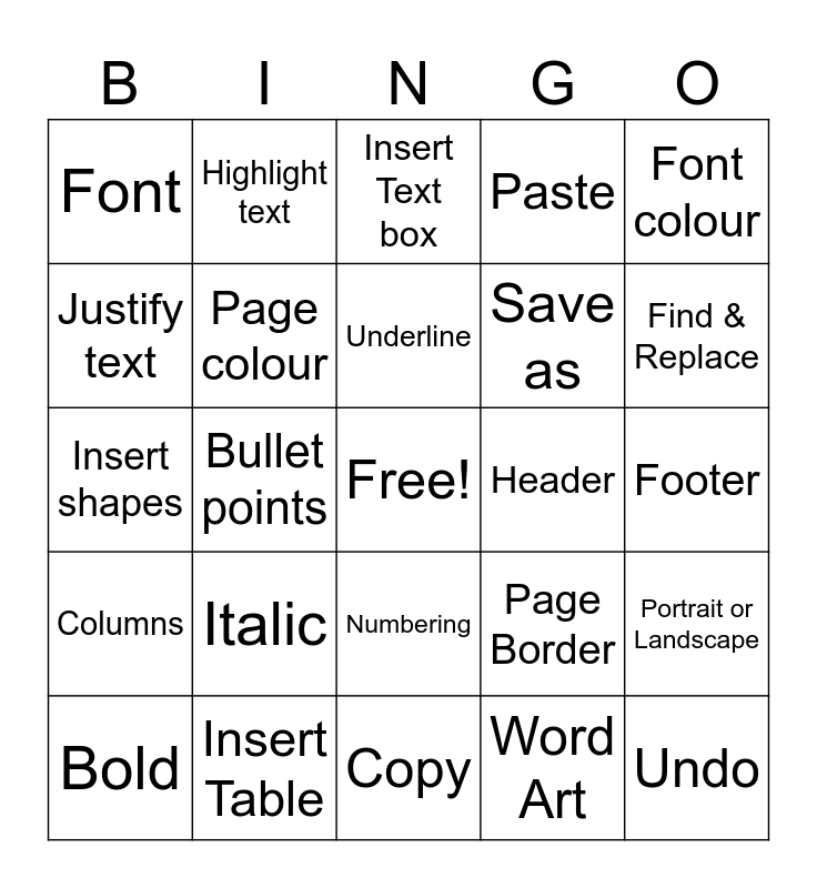 This bingo card has a free space and 24 words: Bold, Italic, Underline, Word Art, Font colour, Font, Highlight text, Insert Text box, Header, Footer, Insert shapes, Page colour, Page Border, Portrait or Landscape, Justify text, Insert Table, Copy, Paste, Find & Replace, Columns, Bullet points, Numbering, Save as and Undo.