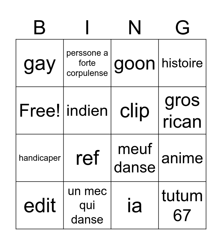 This bingo card has 16 words: un mec qui danse, anime, goon, gay, handicaper, perssone a forte corpulense, meuf danse, ia, Free!, indien, edit, histoire, ref, gros rican, clip and tutum 67.