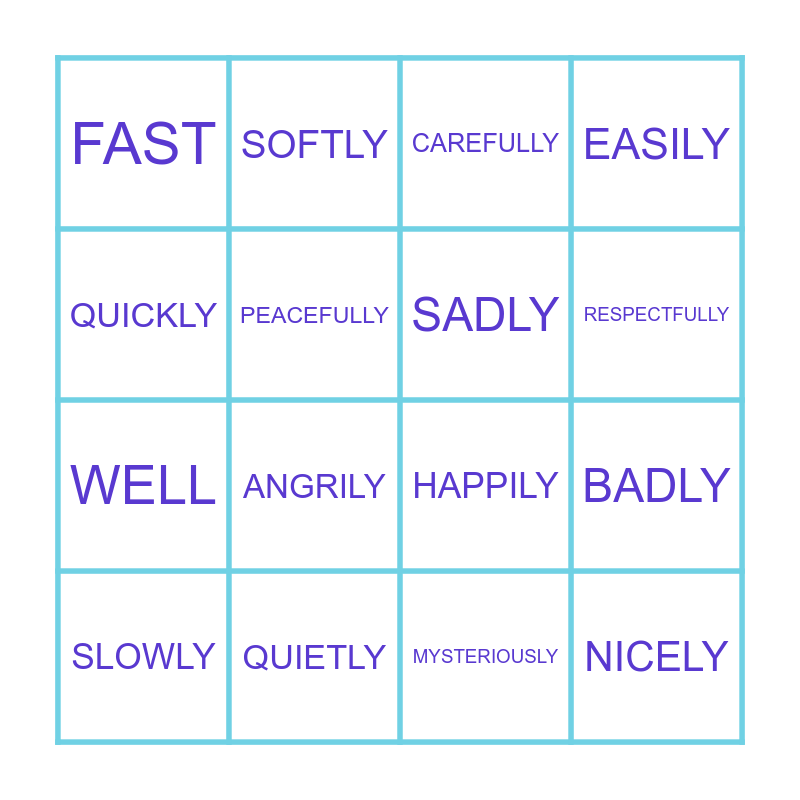 This bingo card has 20 words: BADLY, BEAUTIFULLY, CAREFULLY, LOUDLY, SLOWLY, QUICKLY, QUIETLY, FAST, WELL, SOFTLY, ANGRILY, HAPPILY, PEACEFULLY, NICELY, SADLY, CORRECTLY, RESPECTFULLY, EASILY, MYSTERIOUSLY and NERVOUSLY.